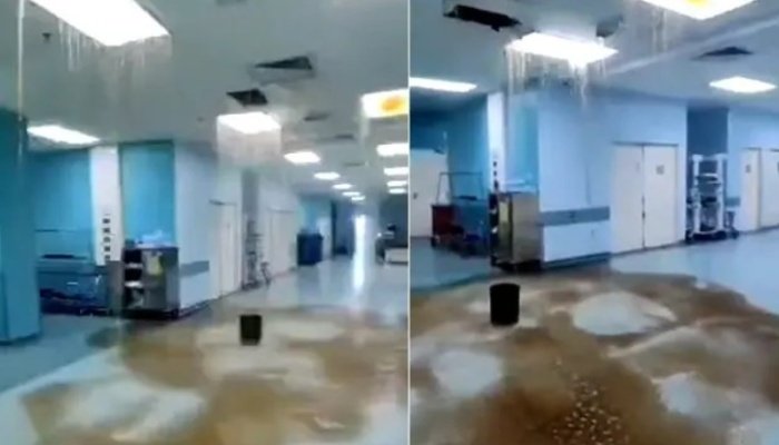 மருத்துவமனையின் கூரை இடிந்து விழுந்ததில், மழைநீர் அருவி போல வார்டுகளுக்குள் புகுந்தது.