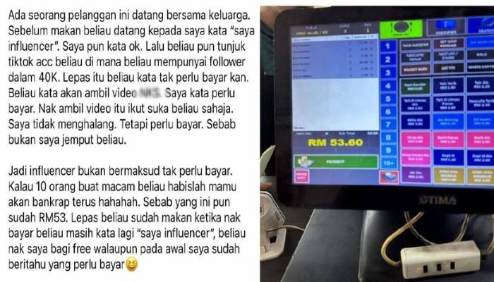 தனது உணவகத்திற்கு, 40,000 ‘followers’ஐ கொண்ட பிரபலம் ஒருவர் குடும்பத்தோடு வருகை புரிந்ததோடு மட்டுமல்லாமல் தன்னை அணுகி தான் ஒரு டிக்டோக் பிரபலம் என்று கூறி, சாப்பிடுவதற்கு முன்பும் குடும்பத்துடன் உணவை உண்டுவிட்டு, பணத்தைக் கட்டும் சமயத்தி மொத்தம் 53.60 ரிங்கிட் எனக் கூறிய போதும் மீண்டும் தான் பணம் கட்ட வேண்டுமா என்ற கேட்டுள்ளார்.