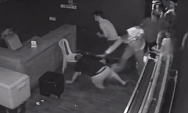 சமூக ஊடகங்களில் பரவிய CCTV காட்சிகளில், அந்நபர் துரத்தப்பட்டு, நாற்காலிகள் மற்றும் பெட்டிகளால் தாக்கப்பட்டு, கடைசியில் குத்தப்பட்டது தெரிகிறது.