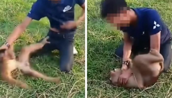 வீடியோவில், ஒரு நபர் குரங்கை அதன் கழுத்தில் கட்டப்பட்ட மெல்லிய கயிற்றால் இழுத்து, கீழே தள்ளிப் பிடிக்கிறார்.