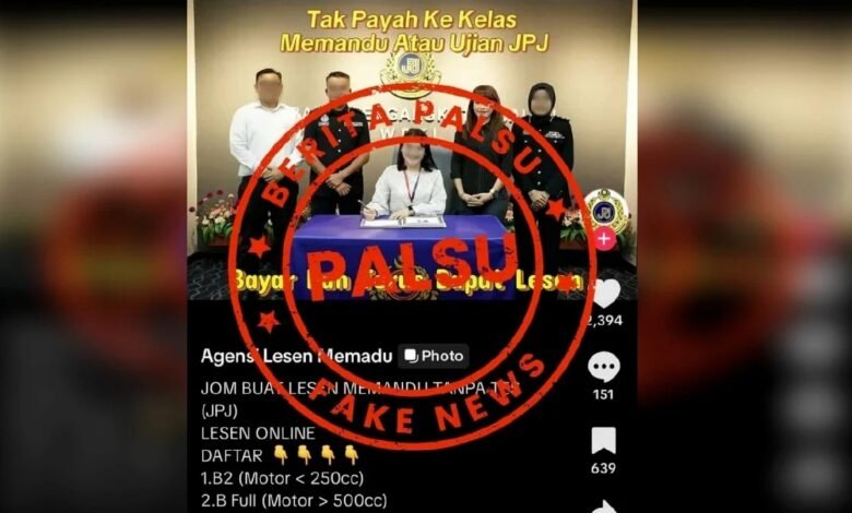 JPJ எனப்படும் சாலை போக்குவரத்துத் துறையின் அதிகாரப்பூர்வ பெயர் மற்றும் சின்னத்தை பயன்படுத்தி, சோதனை இல்லாமல் இலவச ஓட்டுநர் உரிமங்கள்கள் வழங்கப்படும் என்ற சமூக ஊடக விளம்பரங்களால் ஏமாற வேண்டாம் என்று பொதுமக்களுக்கு ஜே.பி.ஜே எச்சரித்துள்ளது.