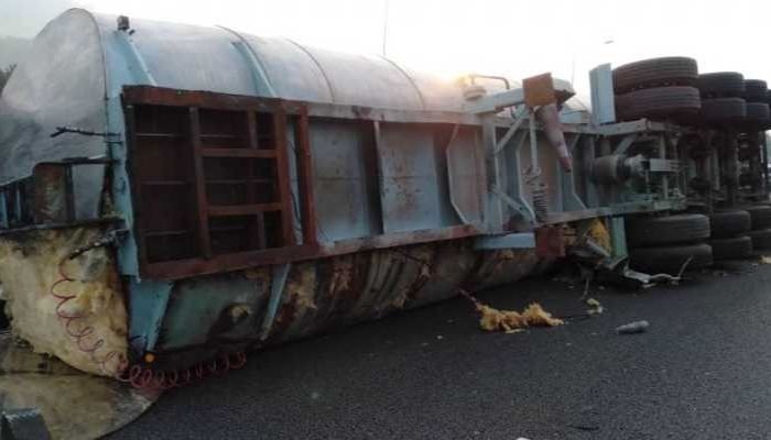 பின்னர் லாரி கவிழ்ந்து தடுப்புச்சுவரில் மோதியதால், Toyota Vios மற்றும் Isuzu Dmax வாகனங்களும் பாதிக்கப்பட்டன.