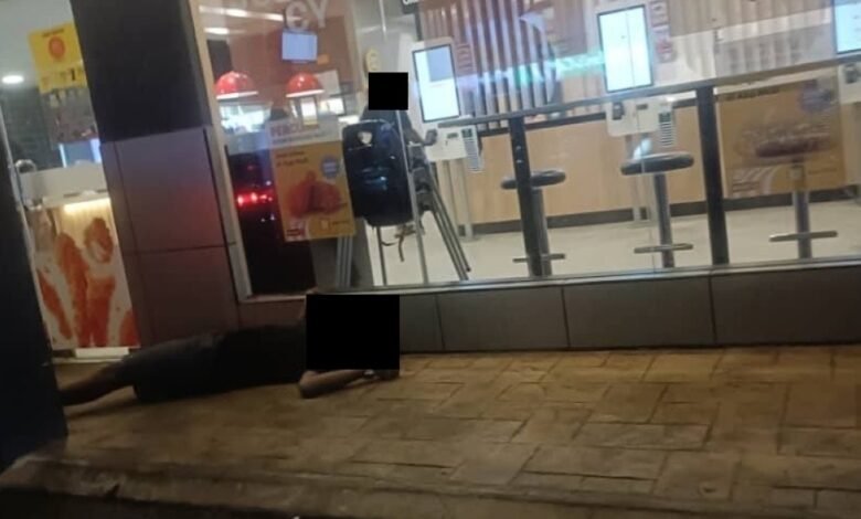 சமூக வலைதளங்களில் பரவி வரும் புகைப்படங்கள் மற்றும் காணொளிகளில், விரைவு உணவகத்தின் வெளிப்புறச் சுவரருகே காயங்களுடன் உணர்விழந்த நிலையில் ஆடவர் ஒருவர் இருப்பதைத் தெளிவாகக் காண முடிகின்றது. அவருக்கருகே உணவகச் சுவரில் இரத்தக் கறைகளும் காணப்பட்டன.