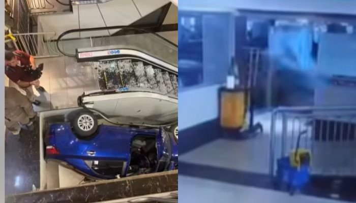 கார் நிறுத்துமிடத்திலிருந்து நேராக கண்ணாடிகளை உடைத்துக் கொண்டு, மின்படிகட்டில் கார் செங்குத்தாக விழுந்துகிடப்பதை, வைரலான வீடியோக்களில் காண முடிகிறது.