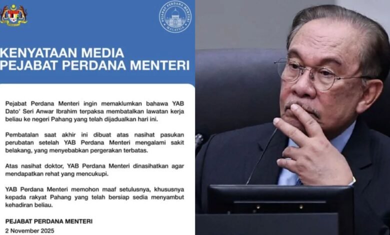 பிரதமர் டத்தோ ஸ்ரீ அன்வார் இப்ராஹிம் முதுகு வலியால் அவதிப்படுவதால், பஹாங் மாநிலத்துக்கான இன்றைய பணி நிமித்தப் பயணத்தை அவர் இரத்துச் செய்துள்ளார்.