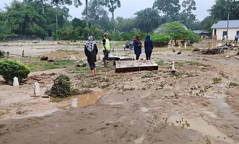 Kuala Trong, Kampung Tok Johan முஸ்லீம் கல்லறையில் வெள்ளம் பெருக்கெடுத்து ஓடி, புதைக்கப்பட்ட உடல்கள் நீரில் மிதந்தன.