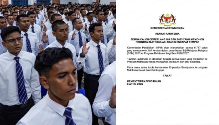 புத்ராஜெயா, ஏப்ரல்-8-2025 SPM தேர்வில் 10A மற்றும் அதற்கு மேல் பெற்ற அனைத்து மாணவர்களுக்கும், மெட்ரிகுலேஷன் படிப்பை மேற்கொள்ள வாய்ப்பு வழங்கப்படும் என, கல்வி அமைச்சு அறிவித்துள்ளது.