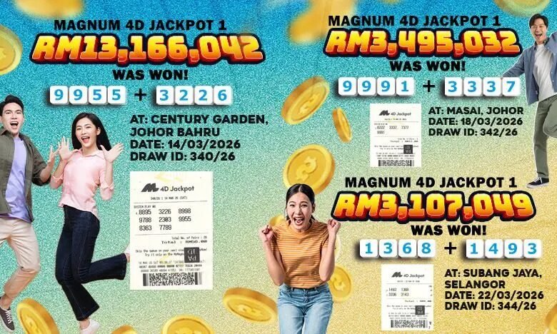 கோலாலாம்பூர், ஏப்ரல்-3-மார்ச் மாதத்திற்கான Magnum 4D Jackpot குலுக்கலில் 3 அதிர்ஷ்டசாலிகள் RM20 மில்லியனுக்கும் அதிகமான பரிசுத் தொகையைத் தட்டிச் சென்றுள்ளனர்.