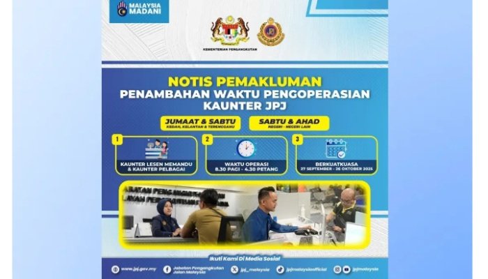 Budi Madani RON95 (BUDI95) திட்டம் செயல்படுத்தப்பட்டதைத் தொடர்ந்து, மக்கள் தங்கள் ஓட்டுநர் உரிமத்தைப் புதுப்பிக்க வசதியாக, செப்டம்பர் 27 ஆம்தேதி முதல் அக்டோபர் 26 ஆம் தேதிவரை நாடு முழுவதும் வார இறுதி நாட்களில் சாலைப் போக்குவரத்துத் துறை (JPJ) அதன் நடவடிக்கை நேரத்தைத் நீட்டிக்கும்.