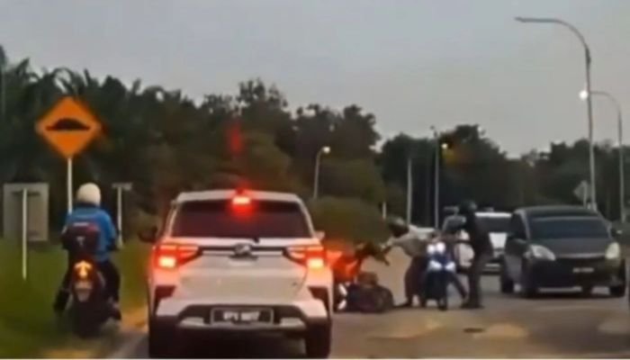 Dash cam கேமராவில் பதிவான காட்சியில், Jalan Keretapi சாலையில் 2 மோட்டார் சைக்கிளோட்டிகள் மாறி மாறி குத்திக் கொள்கின்றனர்.